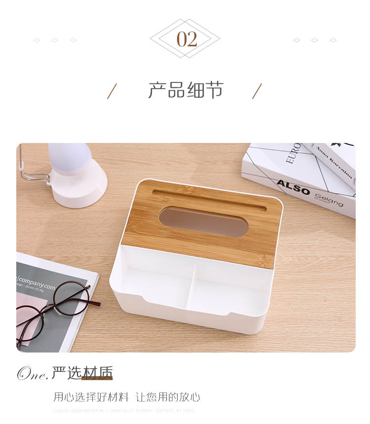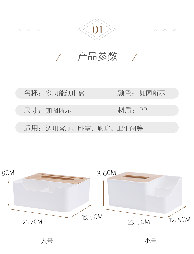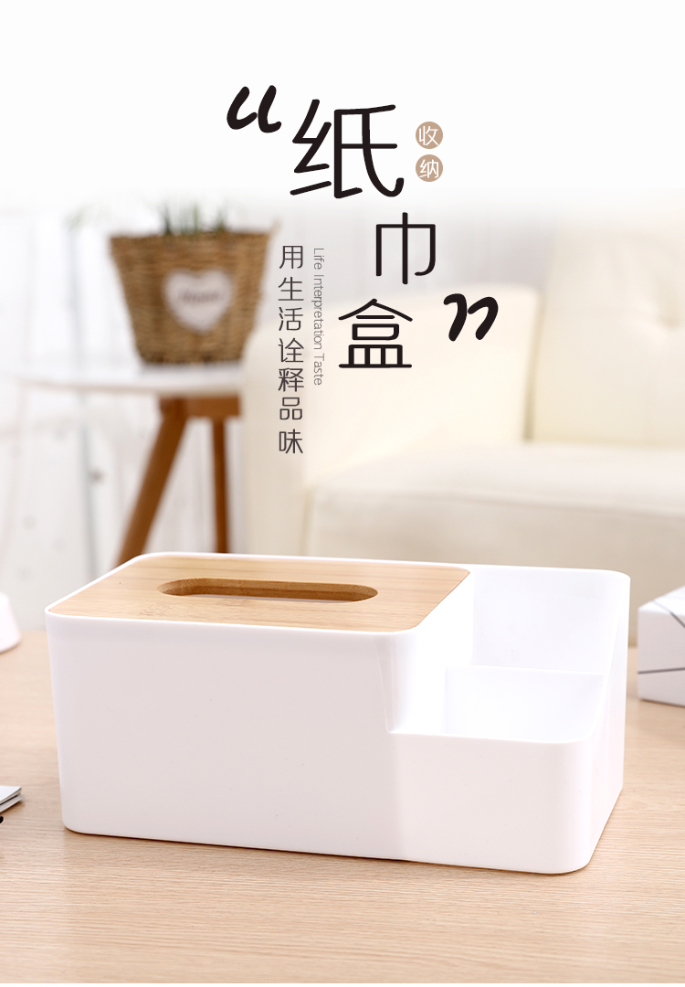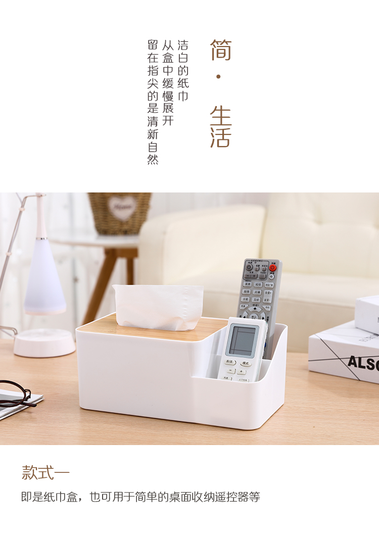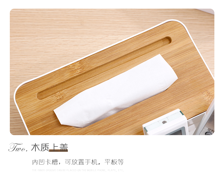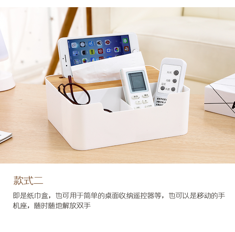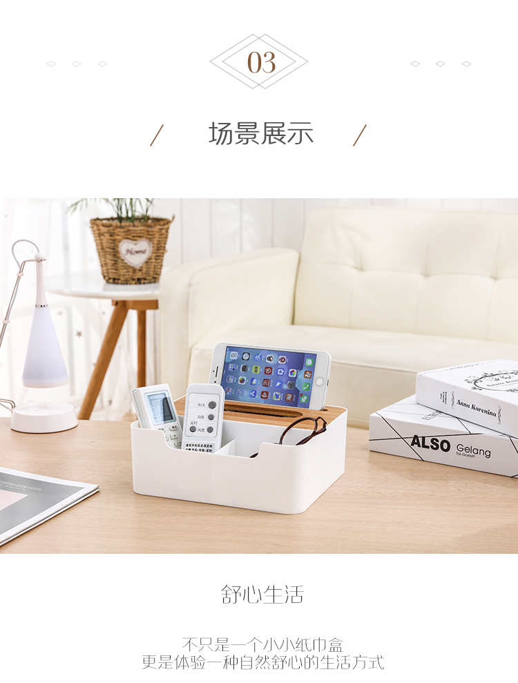 商品名称:简约木盖带手机架纸巾盒 桌面收纳盒--大号(8176) 商品包装:OPP袋 实物拍摄:全自拍图 商品尺寸:21.7*18.5*8cm 商品材质:PP 外箱尺寸: 76*45*50cm